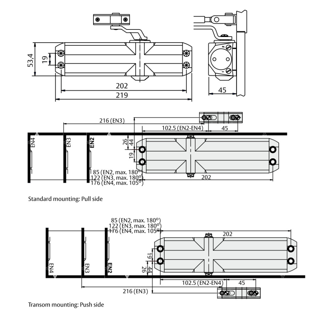 Felső szerelésű ajtócsukó átlagos méretű és átlagos használati intenzitású ajtóra hagyományos háromszög karral, amely adott szögtartományban kitámasztható. Több változatban kapható. TESA termék.