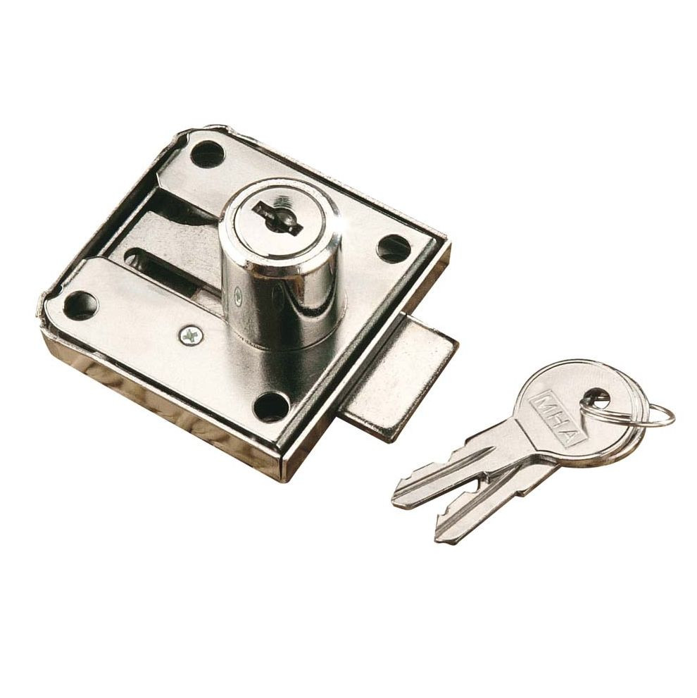 Közel 60 mm méretű rászegzős, krómozott fiókzár, melynek a cilindere elcsúsztatható, 20-45 mm között állítható. Ezáltal többféle fiókzár cseréjére alkalmas. Egyforma zárlattal is rendelhető.