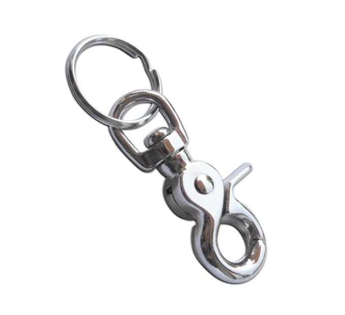 Övre, táskára, szerszámostáskára stb.csatolható kulcstartó funkciójú fém karabíner. Öngyújtóhoz hasonló módon lenyomható és a feje oldalirányban kétfelé nyílik. Krómozott, 30 mm átmérőjű kulcskarikával. Semmilyen hegymászó, falmászó célra nem használható.