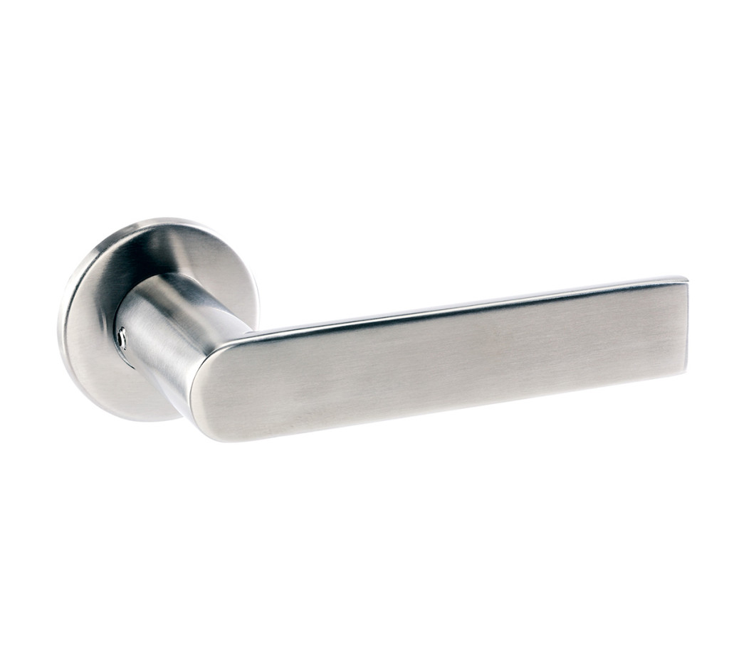 Körcímkés, rugós inox kilincsgarnitúra, 8 mm tengellyel. Lapos, egyenes vonalú kilincs, érdekes forma. Alsó rozetta (cilinderlyukas, kulcslyukas, WC-s) külön rendelhető. Matt inox felület. Az egyszerű cső kilincseknél magasabb árfekvés.