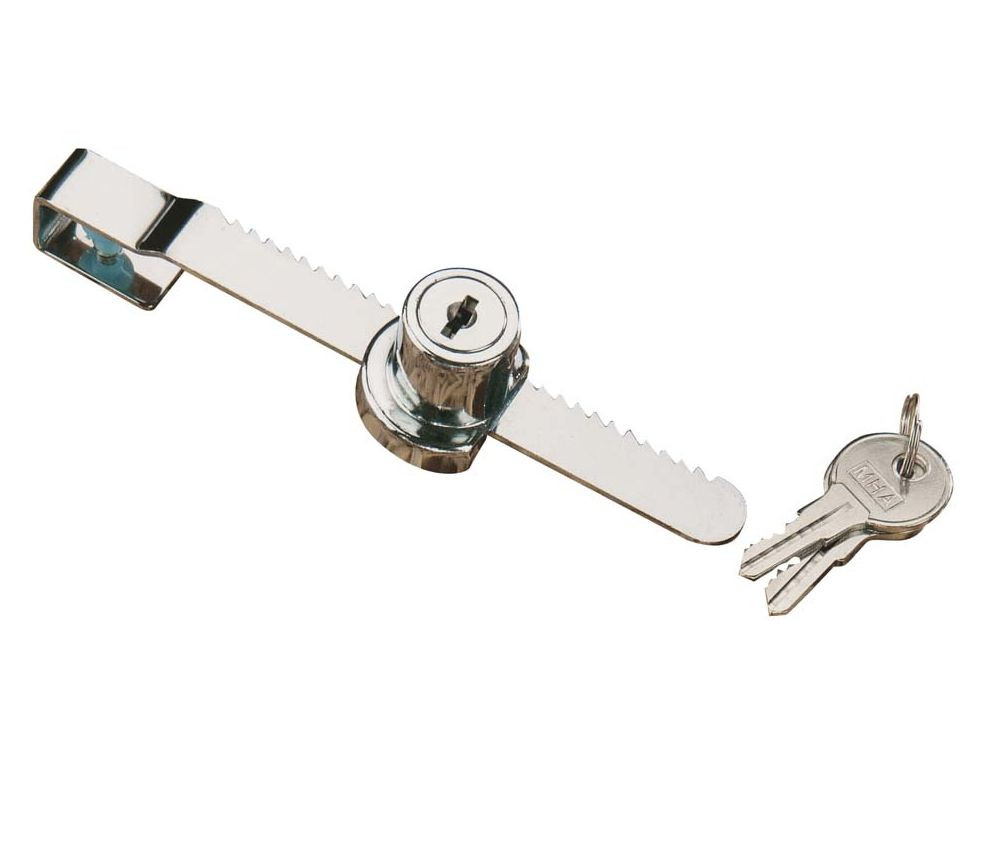 Hagyományos fogazott vitrinzár üveg tolóajtókra. Felszereléséhez nincs szükség az üveg kilyukasztására, egy gumitappancsban végződő csavarral kell az üvegre szorítani. Egyforma zárlatú zárak, a kulcsok kombinációja azonos.