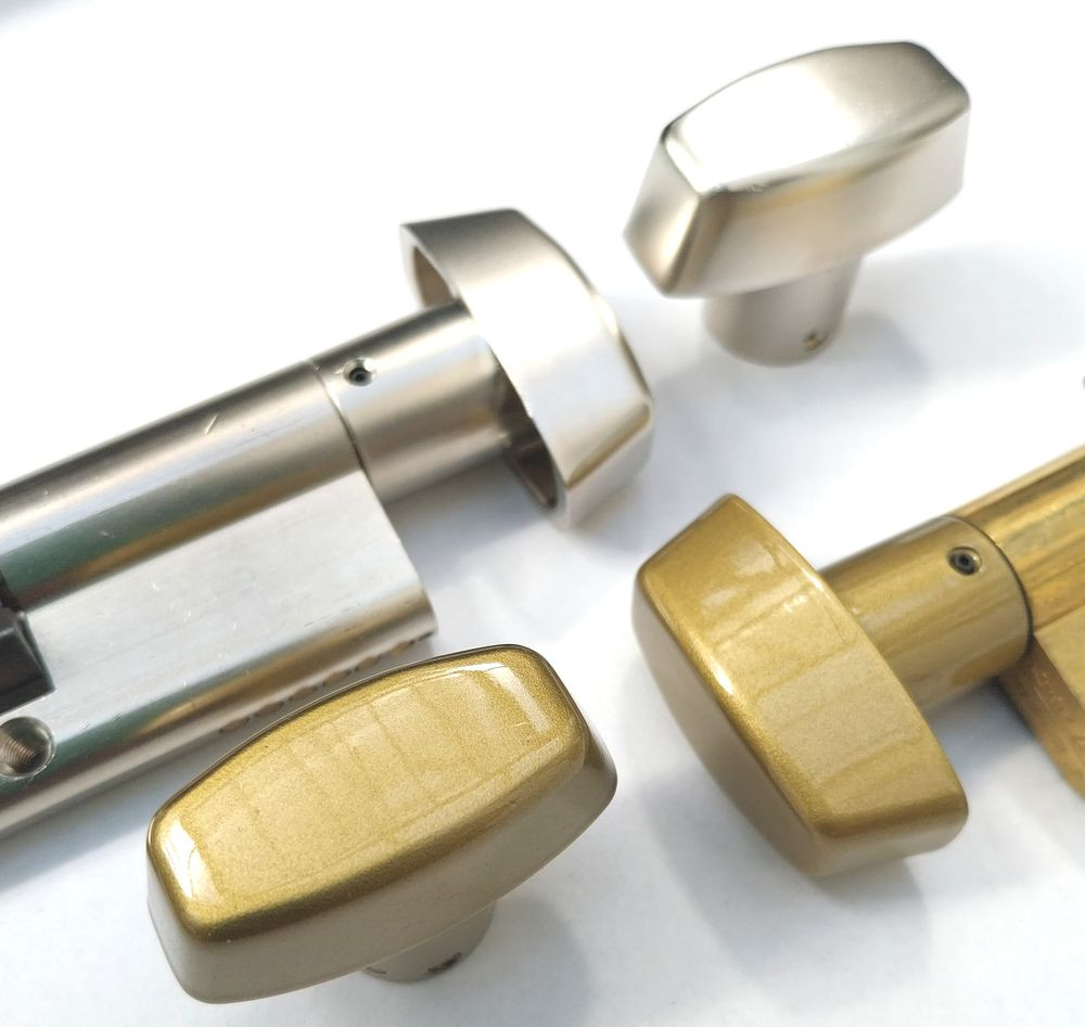 • a TX80 zárbetét sorozat minden mérete felszerelhető forgatógombbal, amely kívülről lehetővé teszi a vésznyitást, belülről pedig a kényelmes használatot. A gomb a betét színéhez igazodva lehet matt króm vagy festett, lakkozott okker szín. A gomb méretei: 19 x 40 mm, a nyak átmérője 18 mm. Fixen 32 mm-nyit áll előre, a tengelyek hossza igazodik a zárbetét méretéhez, a gomb mérete adott.